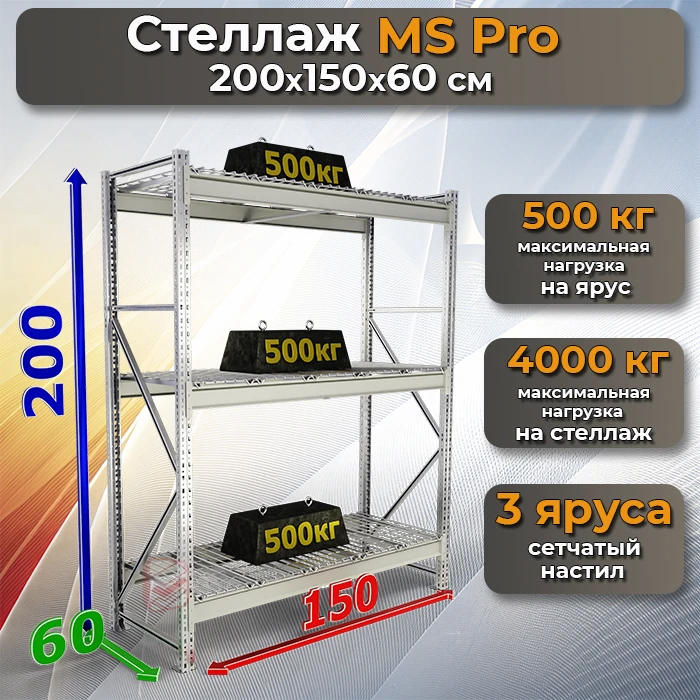 Стеллаж для склада MS Pro 200х150х60 с 3 сетчатыми полками — надежное и практичное решение для организации хранения среднегрузовых грузов на складах, производствах, в гаражах, кладовых и торговых точках.